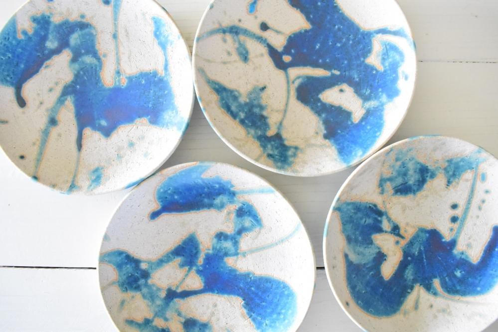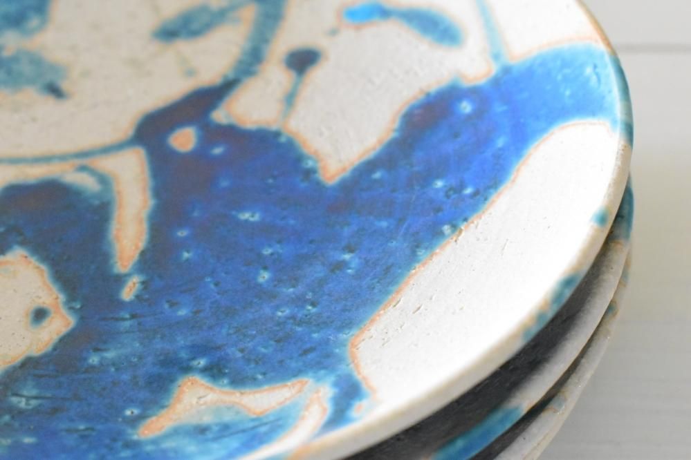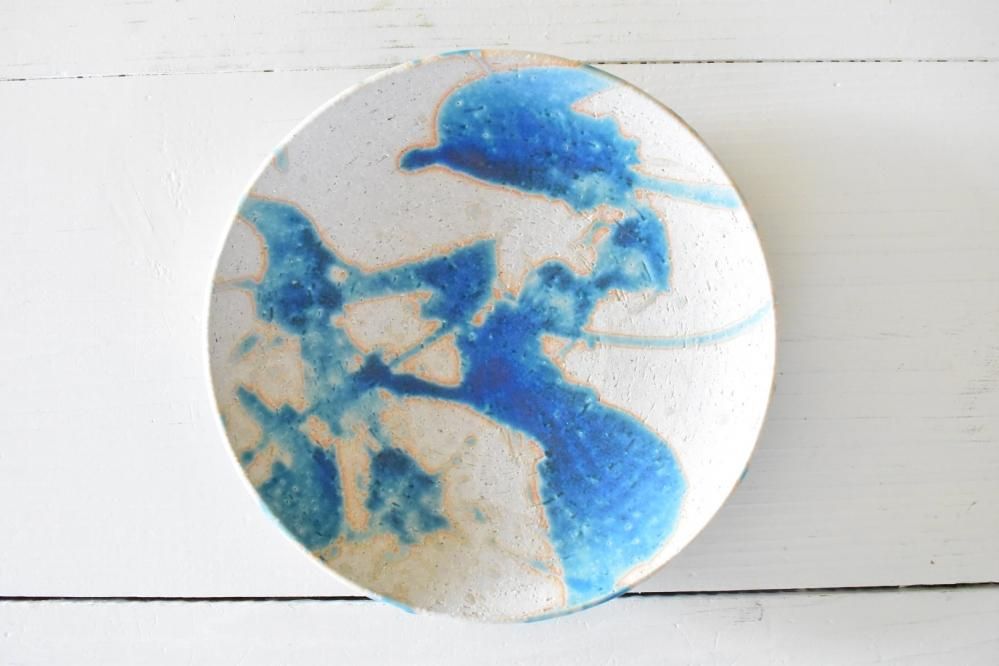 白地に勢いのある鮮やかな青釉の流し掛けが爽やかで、初夏の沖縄に吹く風だけでなく、陽差しに白い雲と青空、砂浜と透き通る青い海、そんな風景までもイメージさせる器。